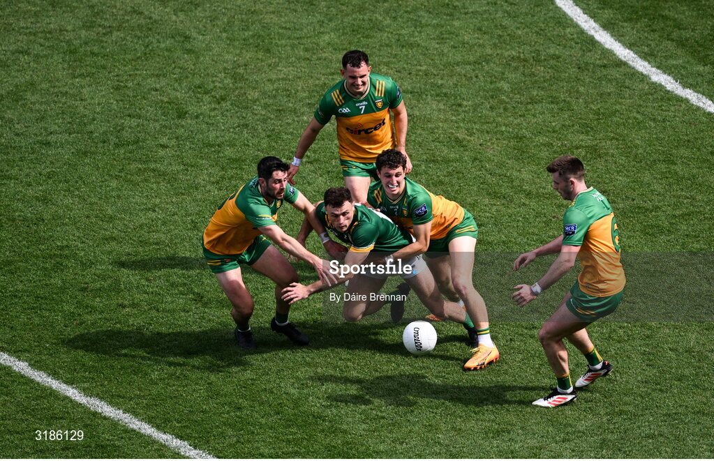 13 July 2025; Jordan Morris of Meath in action against Donegal players, left to right, Ryan McHugh, Caolan McColgan, Finnbarr Roarty, and Eoghan Bán Gallagher during the GAA Football All-Ireland Senior Championship semi-final match between Meath and Donegal at Croke Park in Dublin. Photo by Daire Brennan/Sportsfile