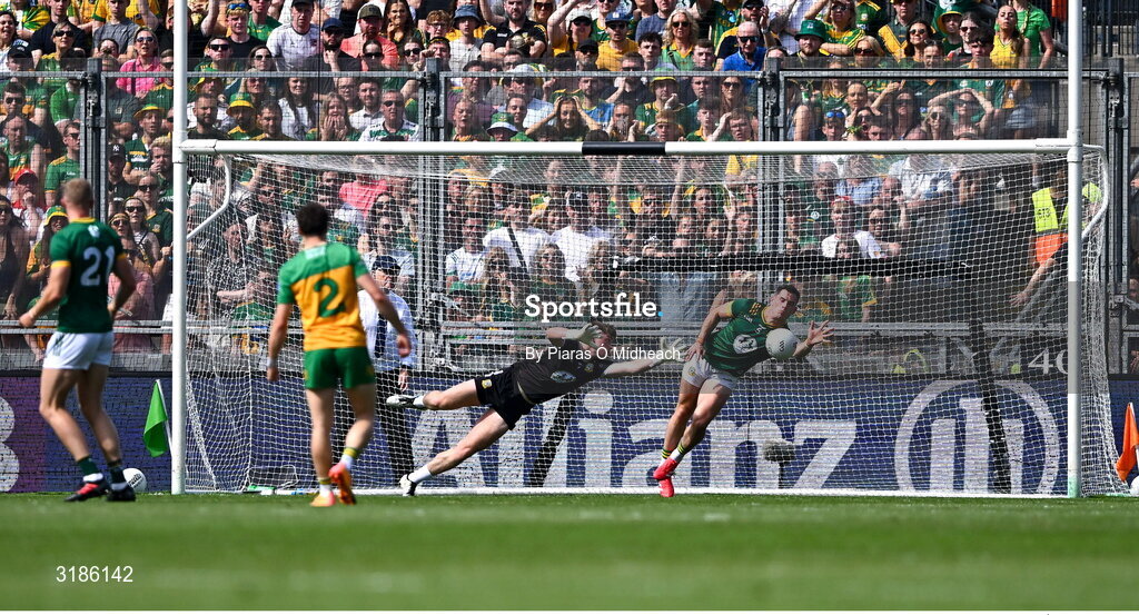 13 July 2025; Donal Keogan of Meath saves a shot on the goal line alongside Meath goalkeeper Billy Hogan the GAA Football All-Ireland Senior Championship semi-final match between Meath and Donegal at Croke Park in Dublin. Photo by Piaras Ó Mídheach/Sportsfile