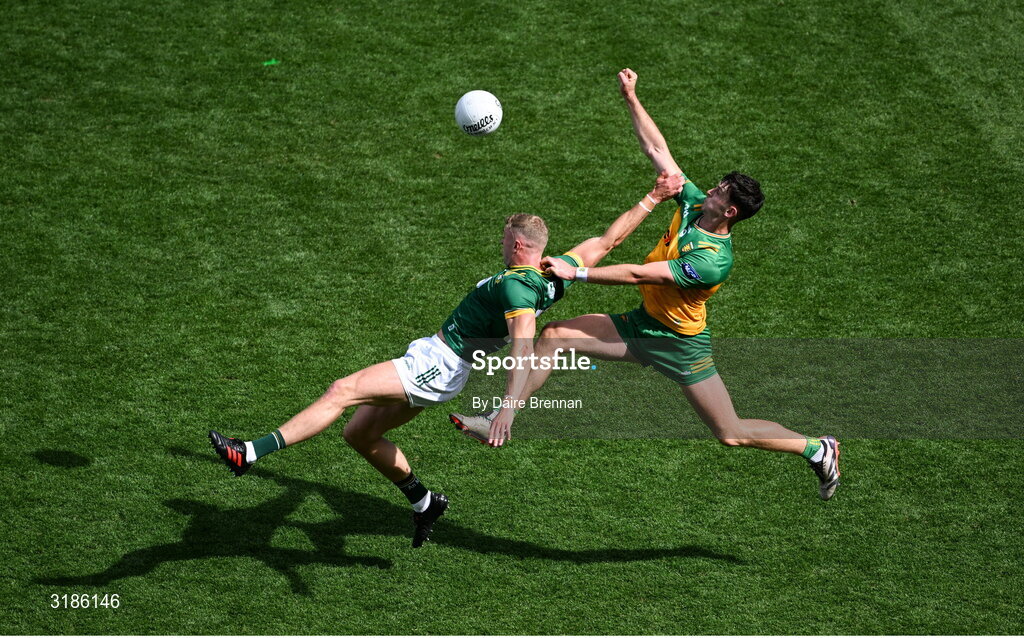13 July 2025; Michael Langan of Donegal in action against Conor Gray of Meath during the GAA Football All-Ireland Senior Championship semi-final match between Meath and Donegal at Croke Park in Dublin. Photo by Daire Brennan/Sportsfile