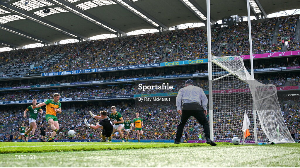 13 July 2025; Meath goalkeeper Billy Hogan saves a shot from Hugh McFadden of Donegal, in the 33rd minute, during the GAA Football All-Ireland Senior Championship semi-final match between Meath and Donegal at Croke Park in Dublin. Photo by Ray McManus/Sportsfile