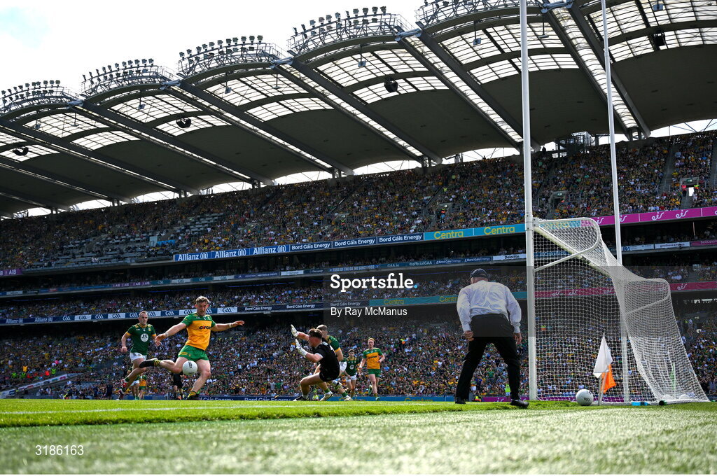 13 July 2025; Meath goalkeeper Billy Hogan saves a shot from Hugh McFadden of Donegal, in the 33rd minute, during the GAA Football All-Ireland Senior Championship semi-final match between Meath and Donegal at Croke Park in Dublin. Photo by Ray McManus/Sportsfile