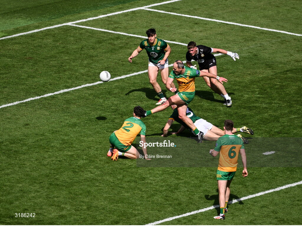 13 July 2025; Michael Murphy of Donegal scores a point during the GAA Football All-Ireland Senior Championship semi-final match between Meath and Donegal at Croke Park in Dublin. Photo by Daire Brennan/Sportsfile