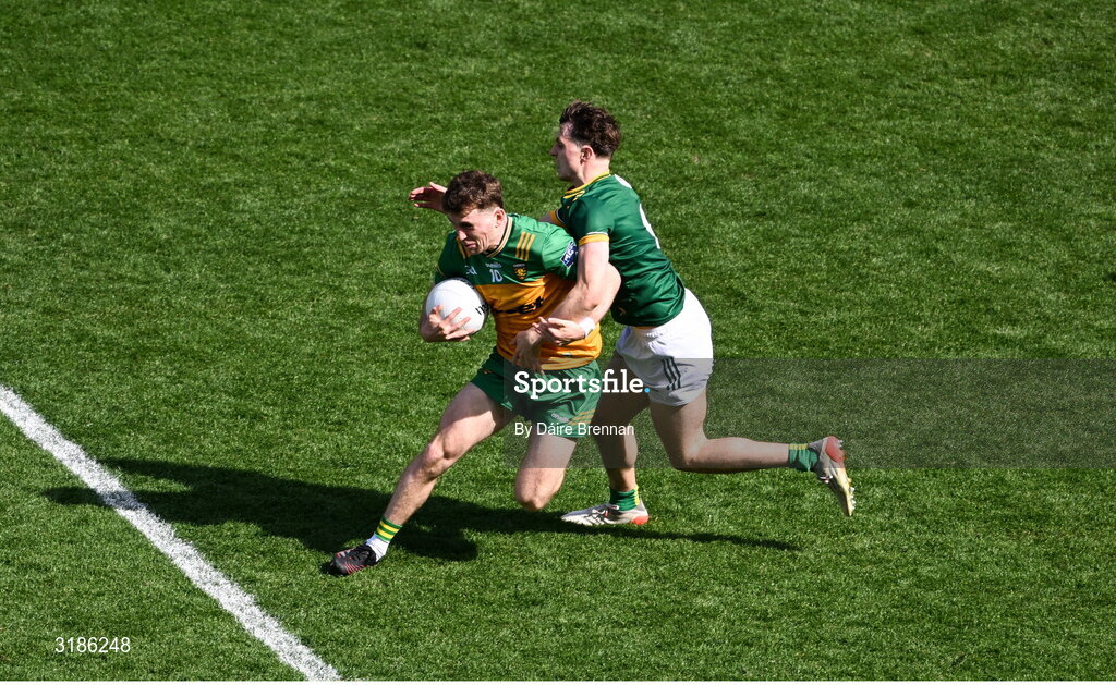 13 July 2025; Shane O'Donnell of Donegal in action against Adam O'Neill of Meath during the GAA Football All-Ireland Senior Championship semi-final match between Meath and Donegal at Croke Park in Dublin. Photo by Daire Brennan/Sportsfile