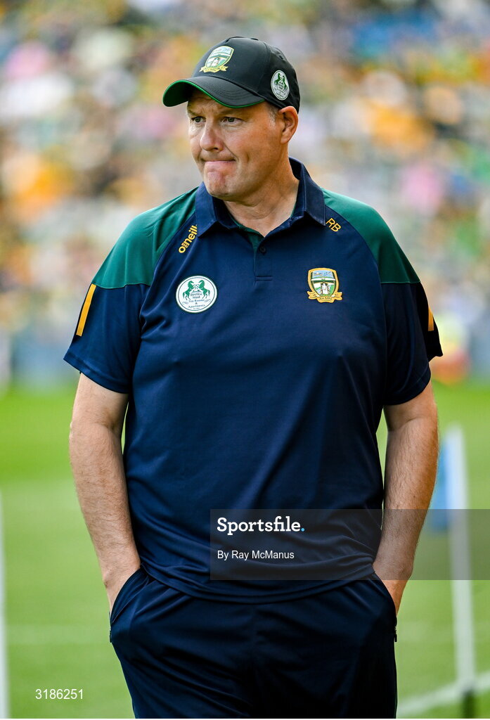 13 July 2025; Meath manager Robbie Brennan in the last minute of the GAA Football All-Ireland Senior Championship semi-final match between Meath and Donegal at Croke Park in Dublin. Photo by Ray McManus/Sportsfile