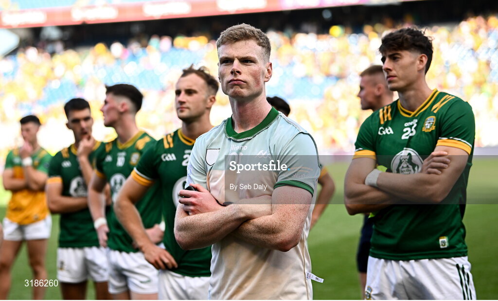 13 July 2025; Mathew Costello of Meath and teammates after their side's defeat in the GAA Football All-Ireland Senior Championship semi-final match between Meath and Donegal at Croke Park in Dublin. Photo by Seb Daly/Sportsfile
