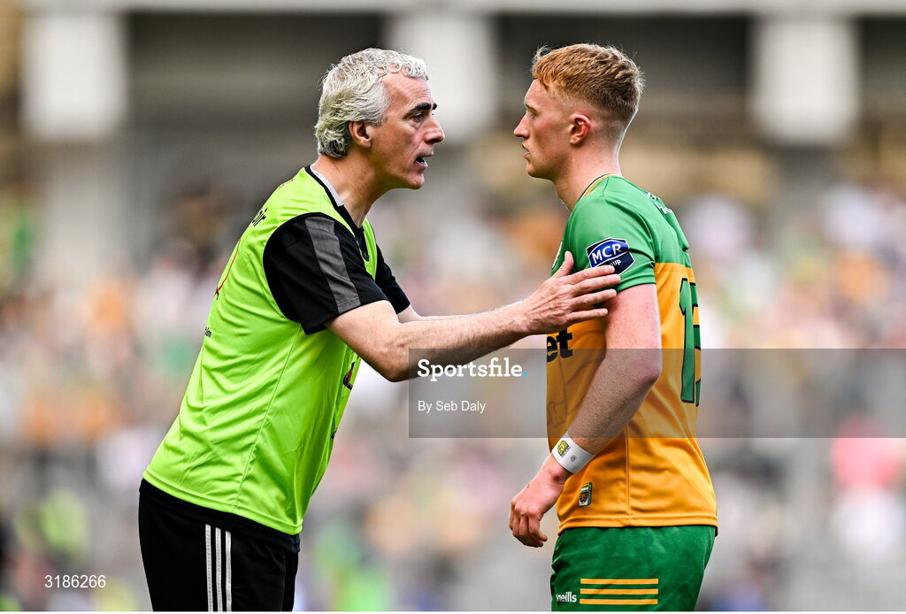 13 July 2025; Donegal manager Jim McGuinness and Oisin Gallen during the GAA Football All-Ireland Senior Championship semi-final match between Meath and Donegal at Croke Park in Dublin. Photo by Seb Daly/Sportsfile