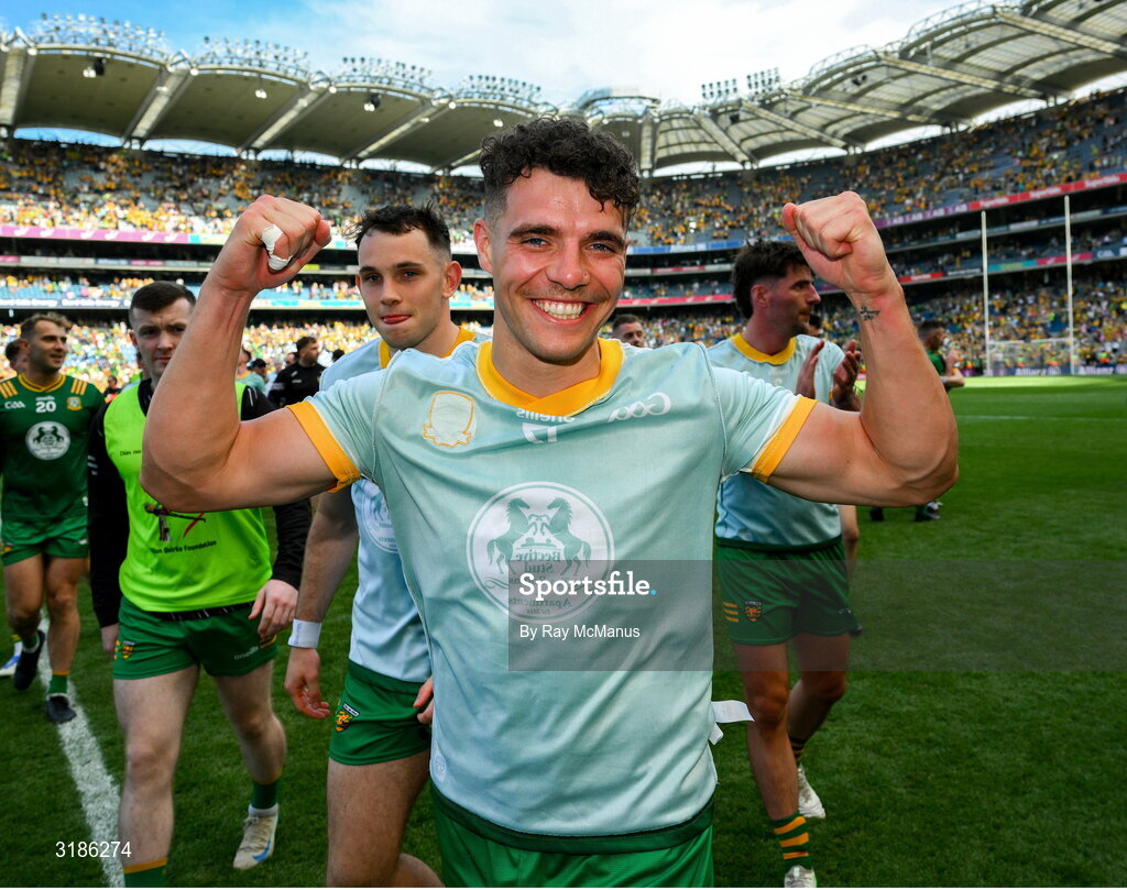 13 July 2025; Odhran McFadden Ferry of Donegal, wearing a Meath shirt, celebrates after the GAA Football All-Ireland Senior Championship semi-final match between Meath and Donegal at Croke Park in Dublin. Photo by Ray McManus/Sportsfile