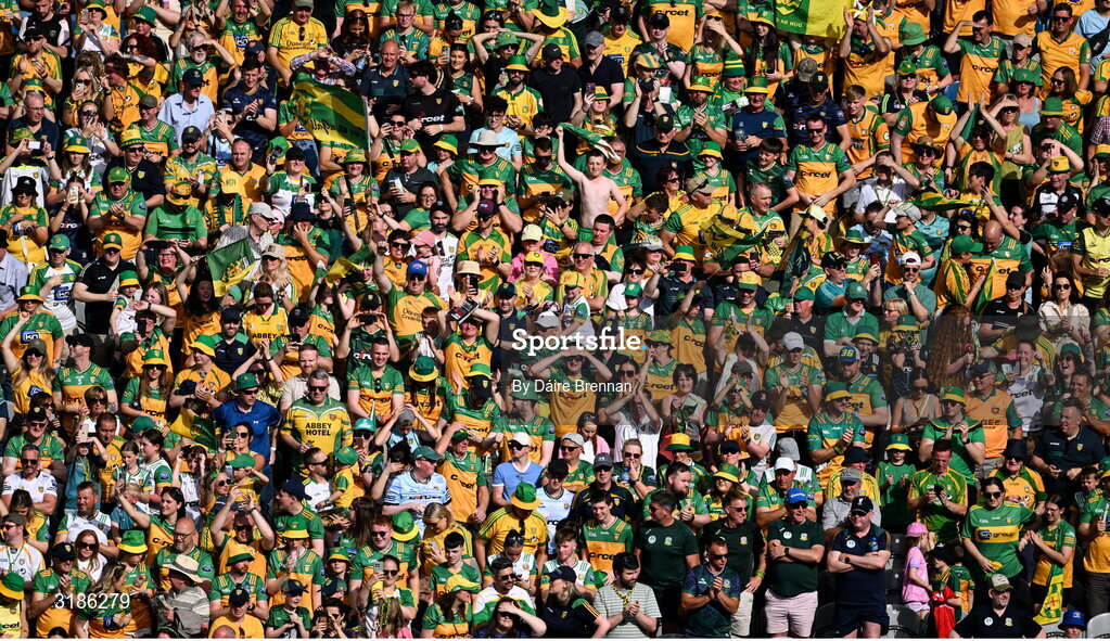 13 July 2025; Donegal supporters celebrate after the GAA Football All-Ireland Senior Championship semi-final match between Meath and Donegal at Croke Park in Dublin. Photo by Daire Brennan/Sportsfile