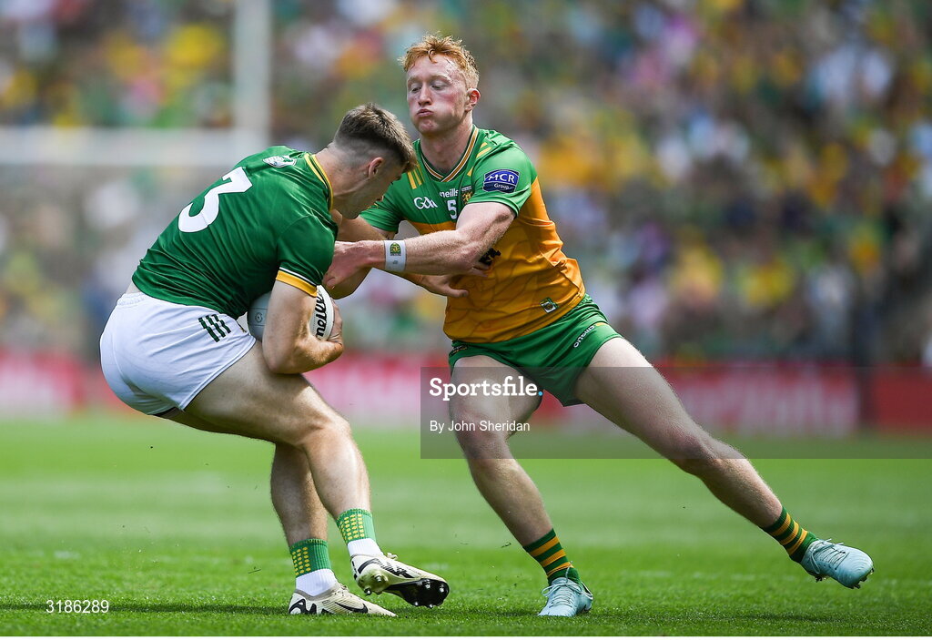 13 July 2025; Seán Rafferty of Meath in action against Ryan McHugh of Donegal during the GAA Football All-Ireland Senior Championship semi-final match between Meath and Donegal at Croke Park in Dublin. Photo by John Sheridan/Sportsfile