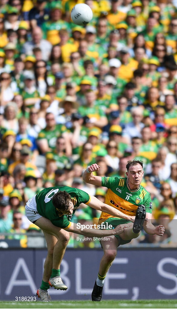 13 July 2025; Ciaran Thompson of Donegal in action against Adam O'Neill of Meath during the GAA Football All-Ireland Senior Championship semi-final match between Meath and Donegal at Croke Park in Dublin. Photo by John Sheridan/Sportsfile