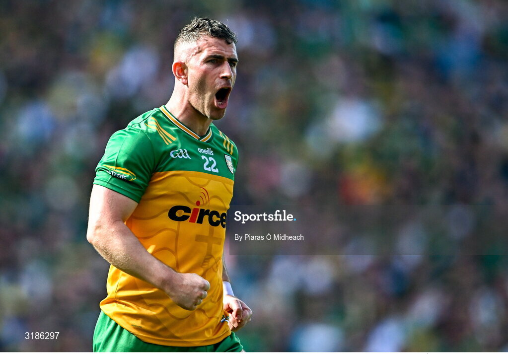 13 July 2025; Patrick McBrearty of Donegal celebrates after scoring a point during the GAA Football All-Ireland Senior Championship semi-final match between Meath and Donegal at Croke Park in Dublin. Photo by Piaras Ó Mídheach/Sportsfile