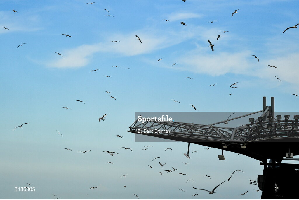 13 July 2025; Seagulls flock around Croke Park after the GAA Football All-Ireland Senior Championship semi-final match between Meath and Donegal at Croke Park in Dublin. Photo by Daire Brennan/Sportsfile