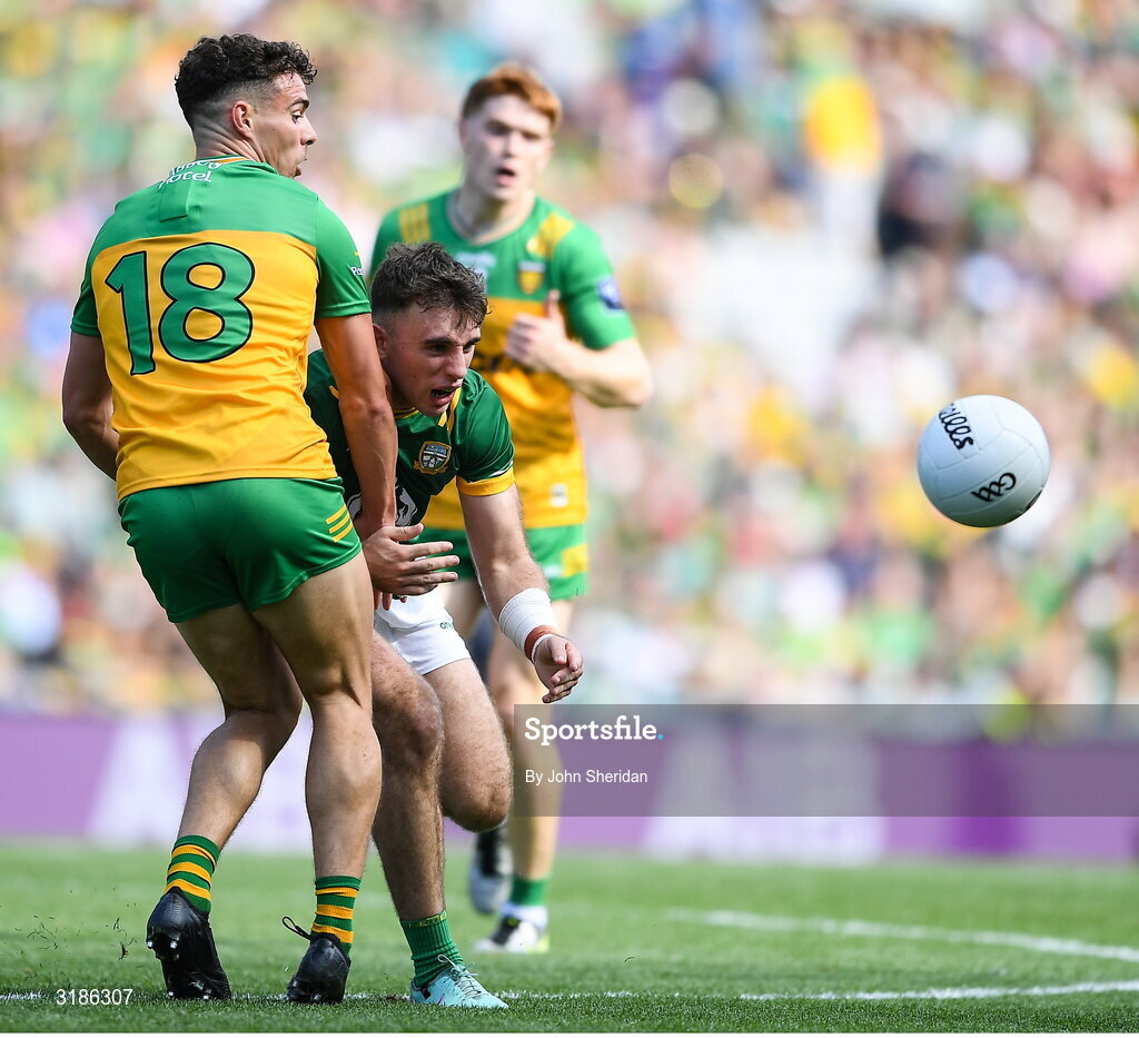 13 July 2025; Seán Coffey of Meath in action against Odhran McFadden Ferry of Donegal during the GAA Football All-Ireland Senior Championship semi-final match between Meath and Donegal at Croke Park in Dublin. Photo by John Sheridan/Sportsfile