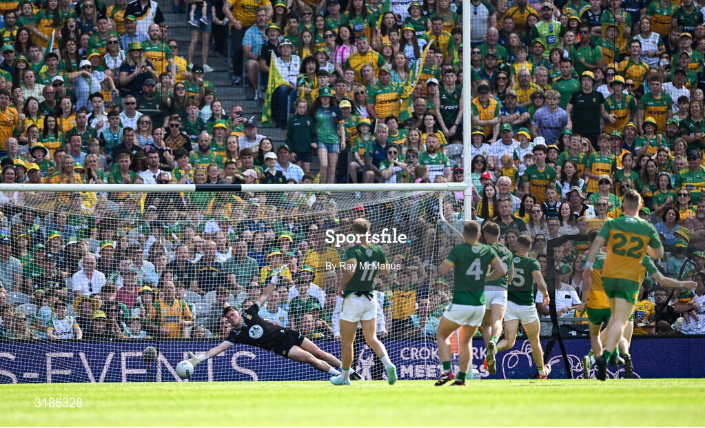 13 July 2025; Meath goalkeeper Billy Hogan is beaten for Donegal's second goal during the GAA Football All-Ireland Senior Championship semi-final match between Meath and Donegal at Croke Park in Dublin. Photo by Ray McManus/Sportsfile
