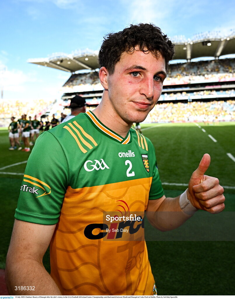 13 July 2025; Finnbarr Roarty of Donegal after his side's victory in the GAA Football All-Ireland Senior Championship semi-final match between Meath and Donegal at Croke Park in Dublin. Photo by Seb Daly/Sportsfile
