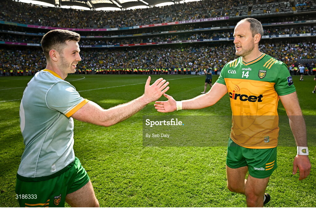 13 July 2025; Donegal players Eoghan Bán Gallagher, left, and Michael Murphy after their side's victory in the GAA Football All-Ireland Senior Championship semi-final match between Meath and Donegal at Croke Park in Dublin. Photo by Seb Daly/Sportsfile
