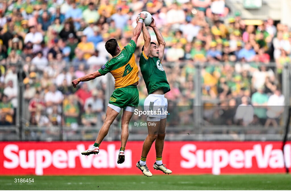 13 July 2025; Ciarán Caulfield of Meath in action against Peadar Mogan of Donegal during the GAA Football All-Ireland Senior Championship semi-final match between Meath and Donegal at Croke Park in Dublin. Photo by Seb Daly/Sportsfile