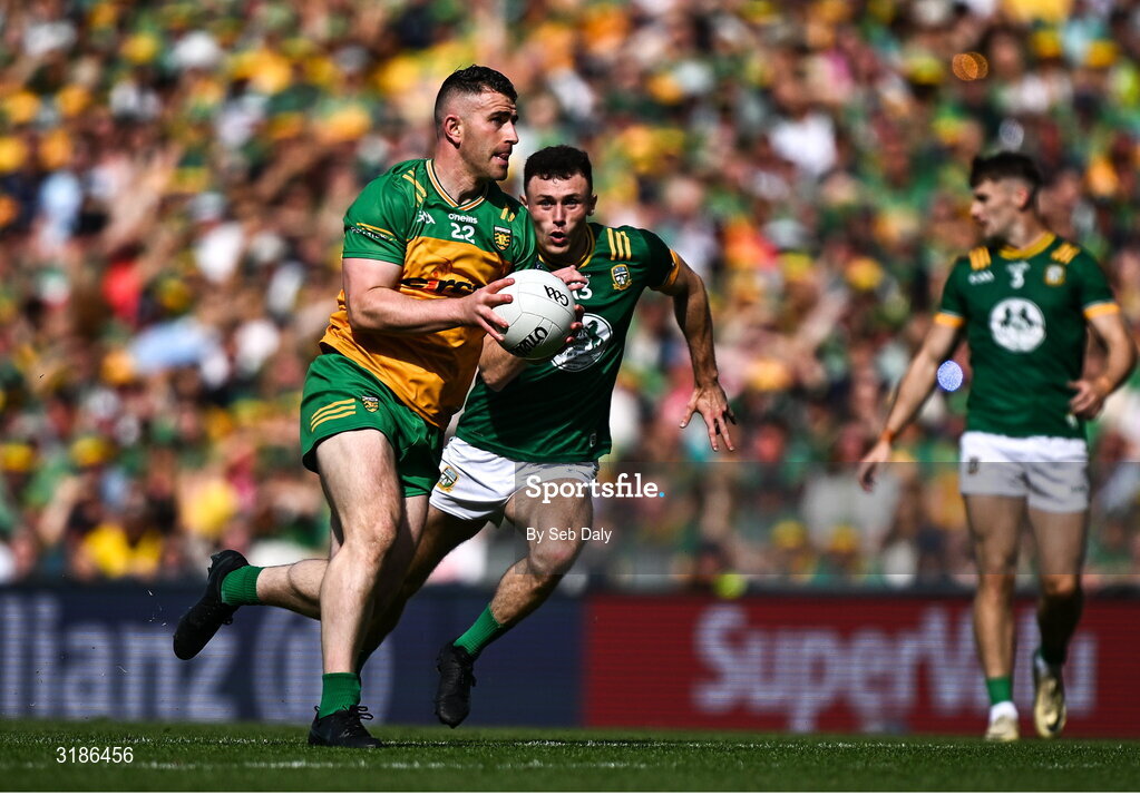13 July 2025; Patrick McBrearty of Donegal in action against Jordan Morris of Meath during the GAA Football All-Ireland Senior Championship semi-final match between Meath and Donegal at Croke Park in Dublin. Photo by Seb Daly/Sportsfile