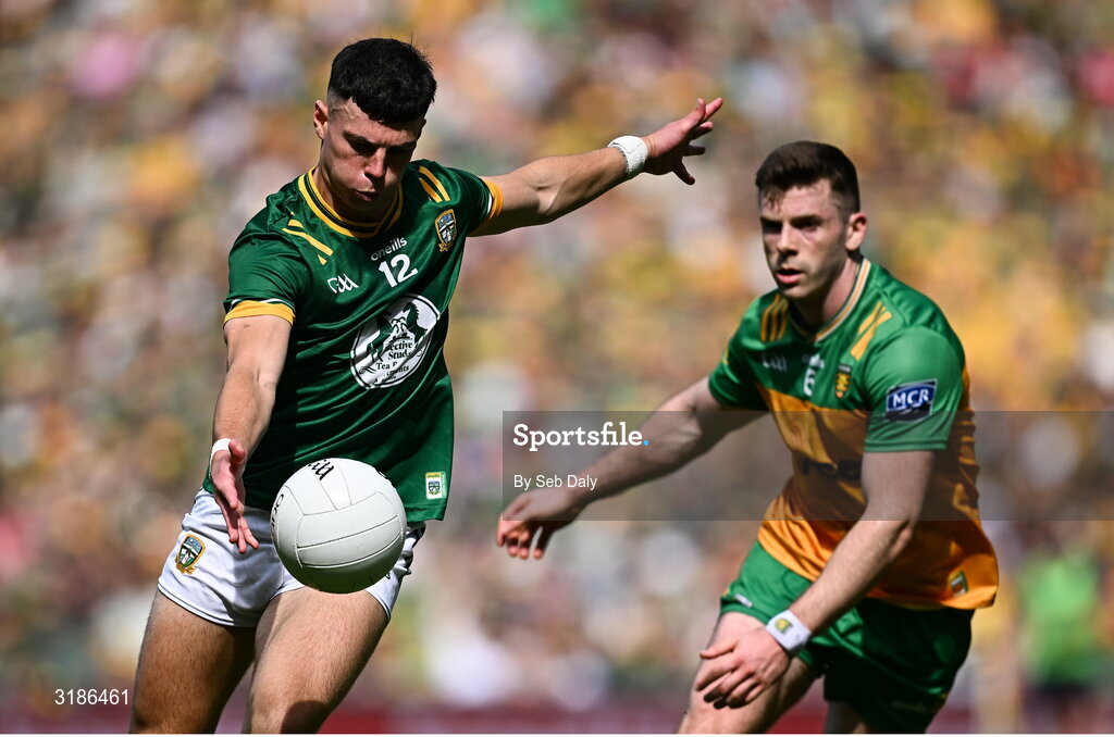 13 July 2025; Keith Curtis of Meath in action against Eoghan Bán Gallagher of Donegal during the GAA Football All-Ireland Senior Championship semi-final match between Meath and Donegal at Croke Park in Dublin. Photo by Seb Daly/Sportsfile