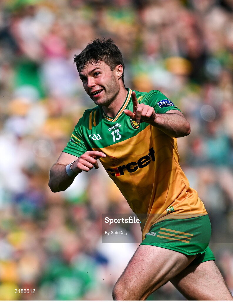 13 July 2025; Conor O'Donnell of Donegal celebrates after scoring his side's third goal during the GAA Football All-Ireland Senior Championship semi-final match between Meath and Donegal at Croke Park in Dublin. Photo by Seb Daly/Sportsfile