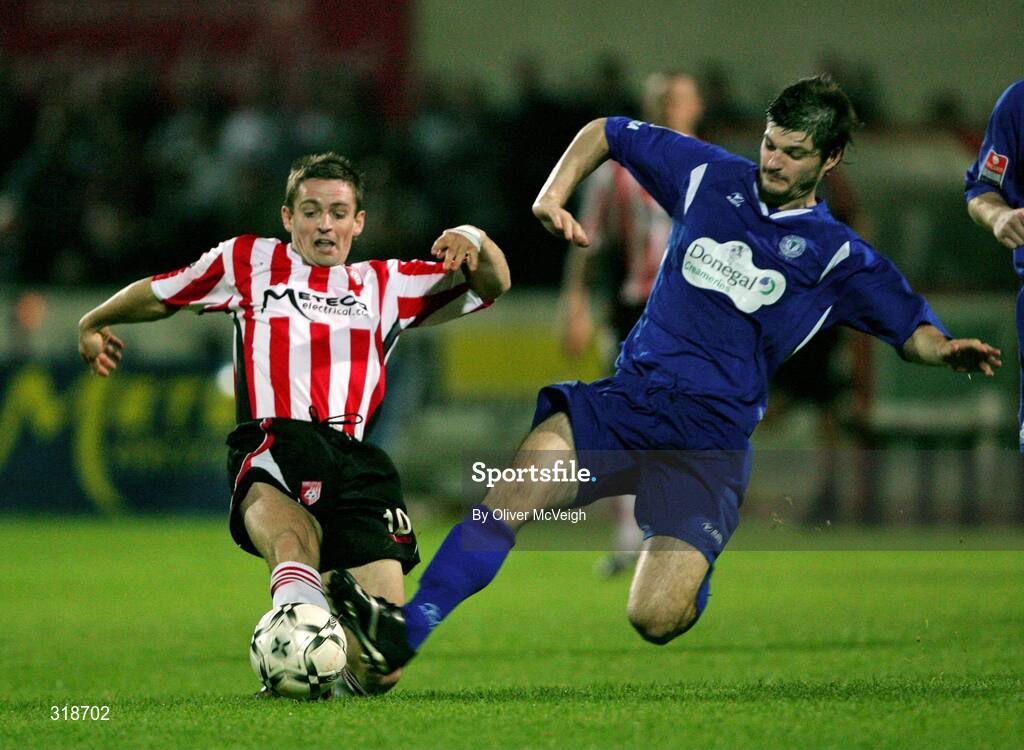 29 August 2008; Kevin McHugh, Derry City, in action against Stuart Malcolm, Finn Harps. eircom league Premier Division, Derry City v Finn Harps, Brandywell, Derry. Picture credit: Oliver McVeigh / SPORTSFILE