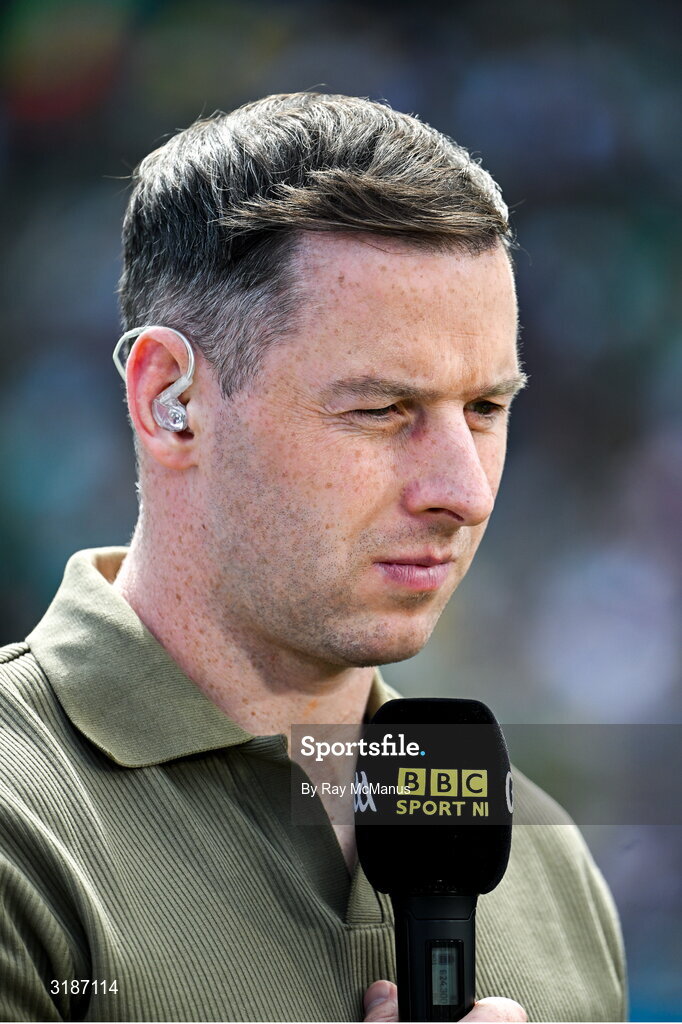 13 July 2025; Former Dublin player Philly McMahon, working with the BBC, before the GAA Football All-Ireland Senior Championship semi-final match between Meath and Donegal at Croke Park in Dublin. Photo by Ray McManus/Sportsfile