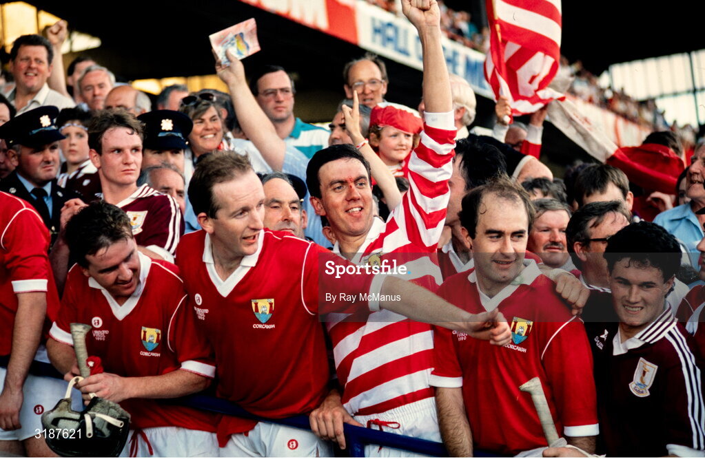 2 September 1990; Cork players, from left, John Fitzgibbon, Dean O'Gorman, Ger Cunningham, Brendan O'Sullivan and Denis Walsh celebrate after the All-Ireland Hurling Final match between Cork and Galway at Croke Park, Dublin. Photo by Ray McManus/Sportsfile