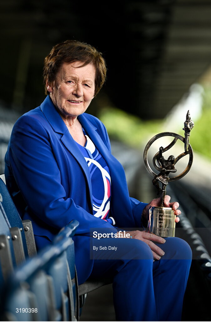 18 July 2025; GPA Lifetime Achievement Award recipient, former Wexford camogie player, Margaret O'Leary-Leacy sits for a portrait with her award during the GPA Hurling and Camogie Legends Lunch at Croke Park in Dublin. Photo by Seb Daly/Sportsfile