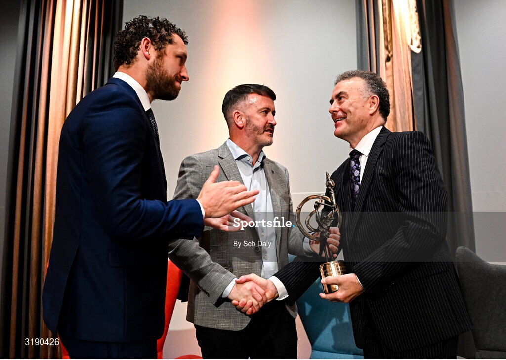 18 July 2025; Former Galway hurler Joe Connolly, right, is presented with his GPA Lifetime Achievement Award by GPA president Dónal Óg Cusack, centre, and GPA chief executive officer Tom Parsons during the GPA Hurling and Camogie Legends Lunch at Croke Park in Dublin. Photo by Seb Daly/Sportsfile