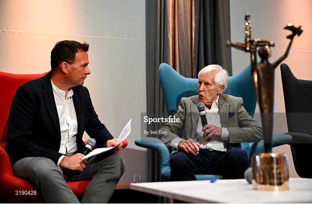 18 July 2025; Former Tipperary hurler Eddie O'Donnell is interviewed by MC Damian Lawlor during the GPA Hurling and Camogie Legends Lunch at Croke Park in Dublin. Photo by Seb Daly/Sportsfile