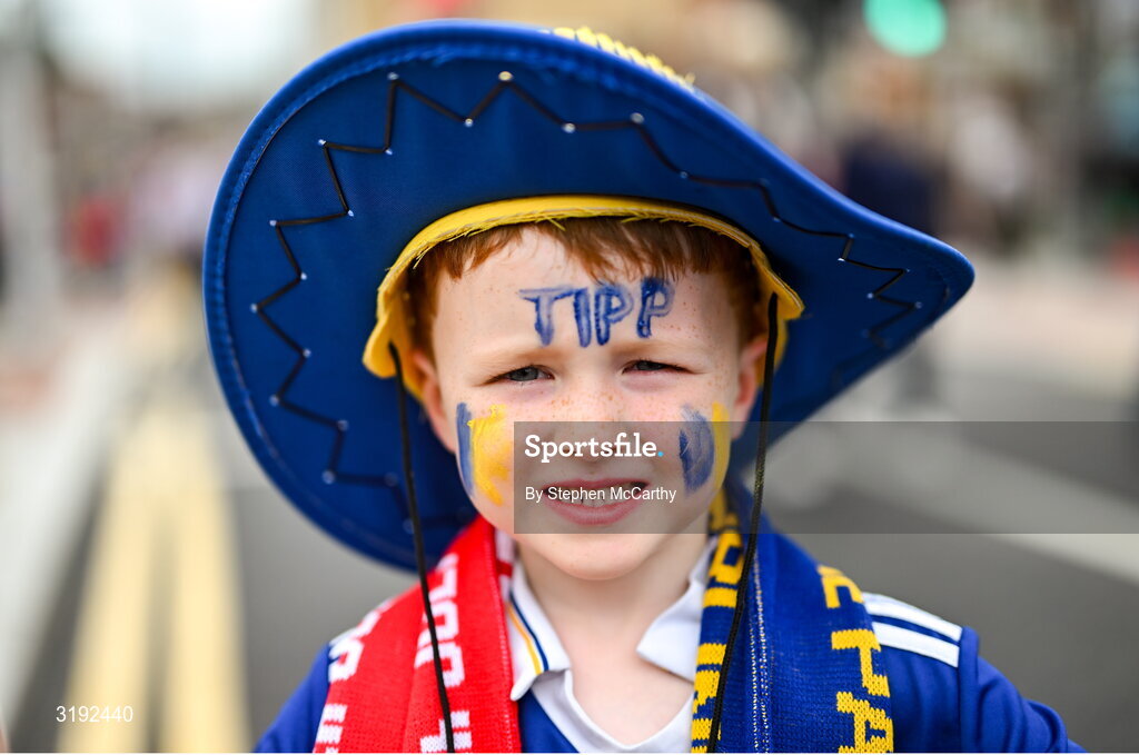 20 July 2025; Tipperary supporter Eóin Foran, age 5, from Carrick-on-Suir in Tipperary, before the GAA Hurling All-Ireland Senior Championship final match between Cork and Tipperary at Croke Park in Dublin. Photo by Stephen McCarthy/Sportsfile