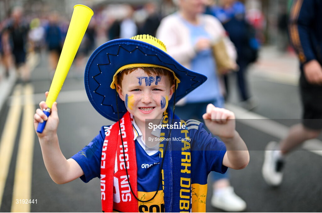 20 July 2025; Tipperary supporter Eóin Foran, age 5, from Carrick-on-Suir in Tipperary, before the GAA Hurling All-Ireland Senior Championship final match between Cork and Tipperary at Croke Park in Dublin. Photo by Stephen McCarthy/Sportsfile