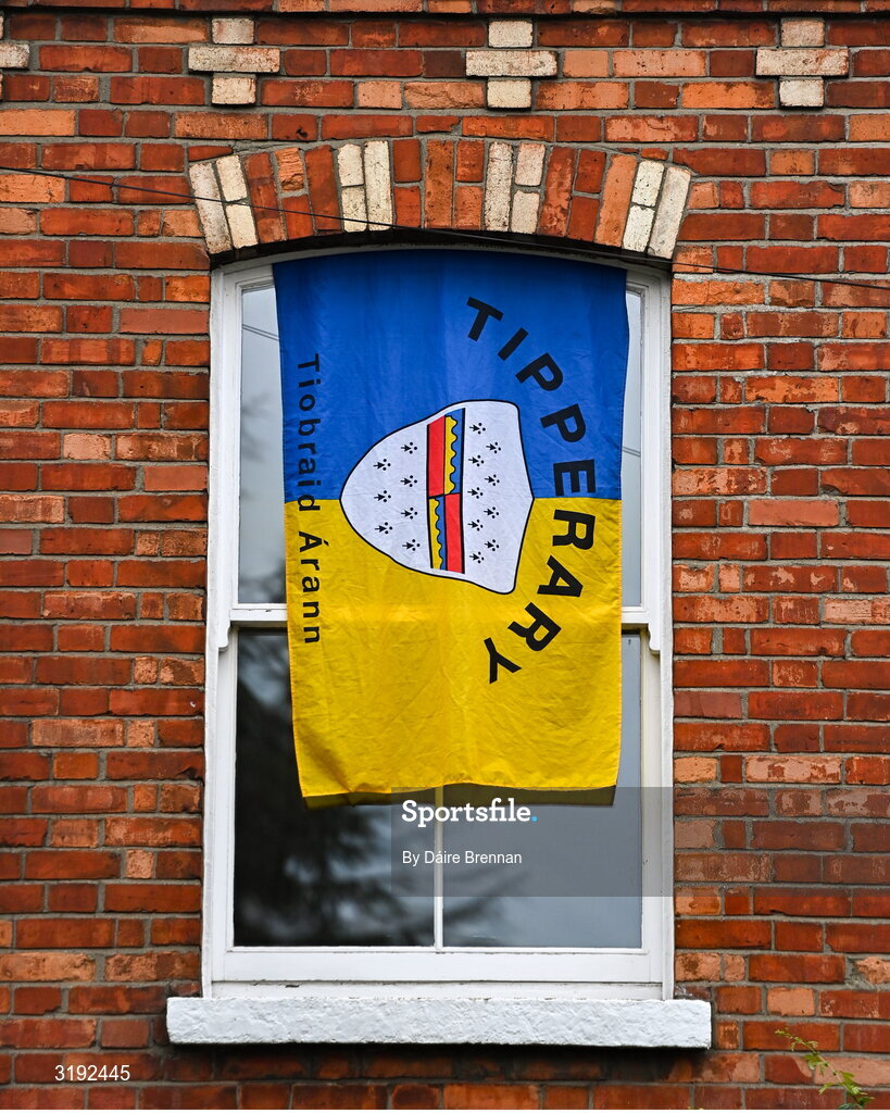 20 July 2025; A Tipperary flag flies out of a house on Jones' Road ahead of the GAA Hurling All-Ireland Senior Championship final match between Cork and Tipperary at Croke Park in Dublin. Photo by Daire Brennan/Sportsfile