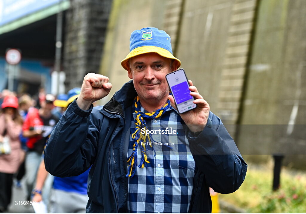 20 July 2025; Tipperary supporter Brian Foley arrives ahead of the GAA Hurling All-Ireland Senior Championship final match between Cork and Tipperary at Croke Park in Dublin. Photo by Daire Brennan/Sportsfile