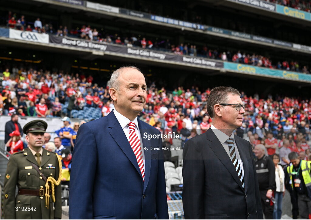 20 July 2025; An Taoiseach Micheál Martin TD and Ard Stiúrthóir of the GAA Tom Ryan arrive before the GAA Hurling All-Ireland Senior Championship final match between Cork and Tipperary at Croke Park in Dublin. Photo by David Fitzgerald/Sportsfile