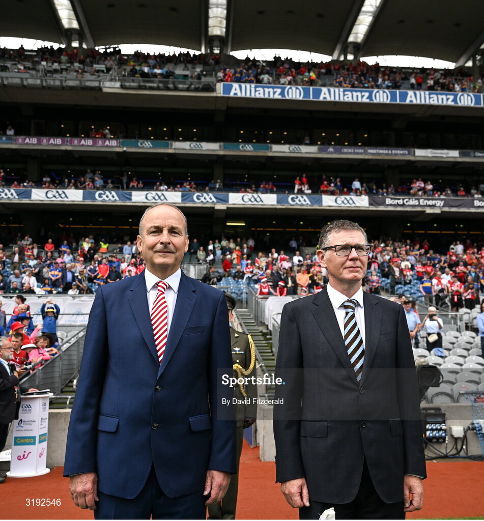20 July 2025; An Taoiseach Micheál Martin TD and Ard Stiúrthóir of the GAA Tom Ryan arrive before the GAA Hurling All-Ireland Senior Championship final match between Cork and Tipperary at Croke Park in Dublin. Photo by David Fitzgerald/Sportsfile