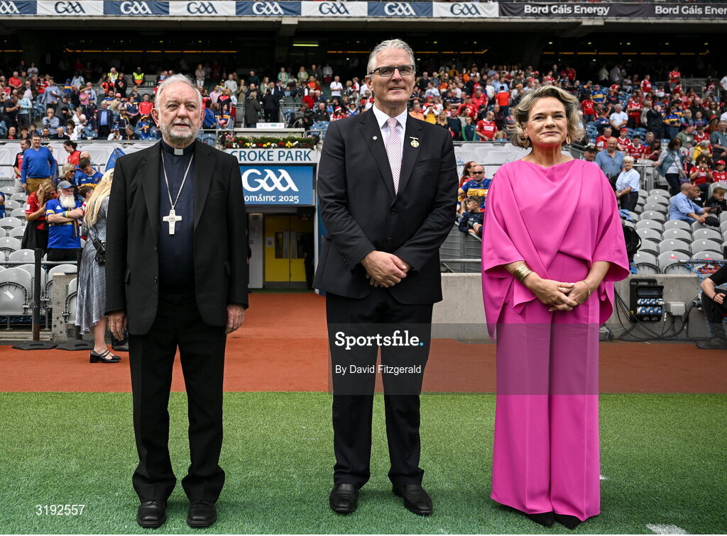 20 July 2025; Patron of the GAA and Bishop of Cashel and Emly Kieran O'Reilly, with Uachtarán Chumann Lúthchleas Gael Jarlath Burns and his wife Suzanne arrive before the GAA Hurling All-Ireland Senior Championship final match between Cork and Tipperary at Croke Park in Dublin. Photo by David Fitzgerald/Sportsfile