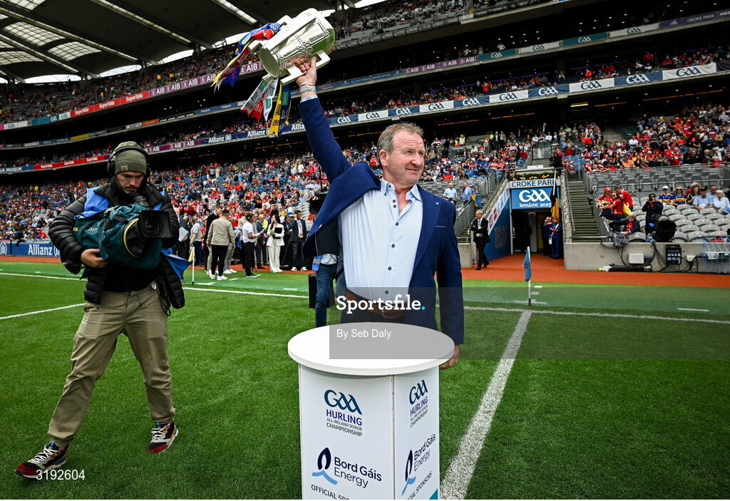 20 July 2025; Kilkenny jubilee team captain from 2000 Willie O'Connor brings out the Liam McCarthy cup to the plinth before the GAA Hurling All-Ireland Senior Championship final match between Cork and Tipperary at Croke Park in Dublin. Photo by Seb Daly/Sportsfile
