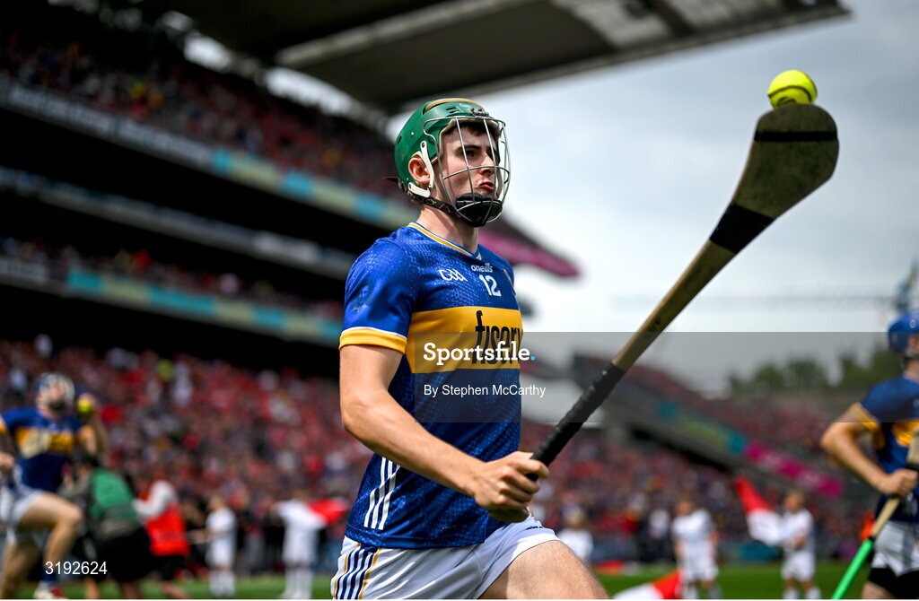 20 July 2025; Sam O’Farrell of Tipperary runs onto the pitch before the GAA Hurling All-Ireland Senior Championship final match between Cork and Tipperary at Croke Park in Dublin. Photo by Stephen McCarthy/Sportsfile