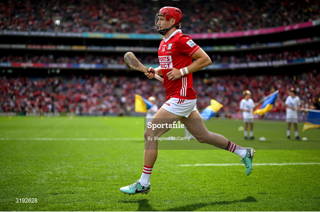 20 July 2025; Alan Connolly of Cork runs onto the pitch before the GAA Hurling All-Ireland Senior Championship final match between Cork and Tipperary at Croke Park in Dublin. Photo by Stephen McCarthy/Sportsfile
