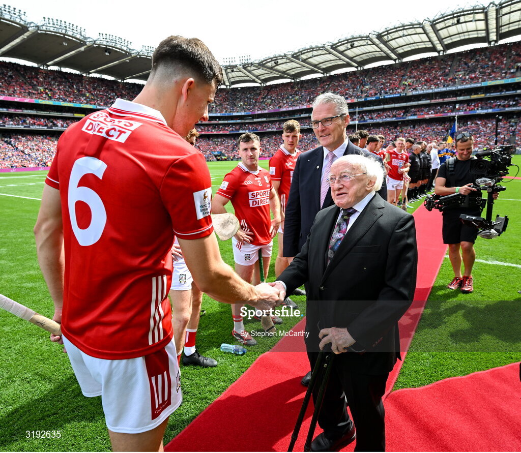 20 July 2025; President of Ireland Michael D Higgins, in the company of Uachtarán Chumann Lúthchleas Gael Jarlath Burns, meets Cork captain Robert Downey before the GAA Hurling All-Ireland Senior Championship final match between Cork and Tipperary at Croke Park in Dublin. Photo by Stephen McCarthy/Sportsfile
