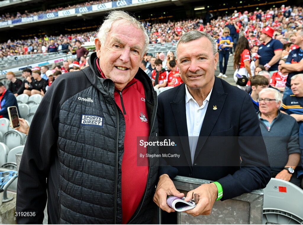 20 July 2025; Cork team doctor Con Murphy, left, with former Cork hurler and manager Jimmy Barry Murphy before the GAA Hurling All-Ireland Senior Championship final match between Cork and Tipperary at Croke Park in Dublin. Photo by Stephen McCarthy/Sportsfile