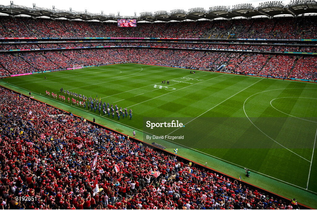 20 July 2025; The Cork and Tipperary teams march behind the Artane School of Music band before the GAA Hurling All-Ireland Senior Championship final match between Cork and Tipperary at Croke Park in Dublin. Photo by David Fitzgerald/Sportsfile