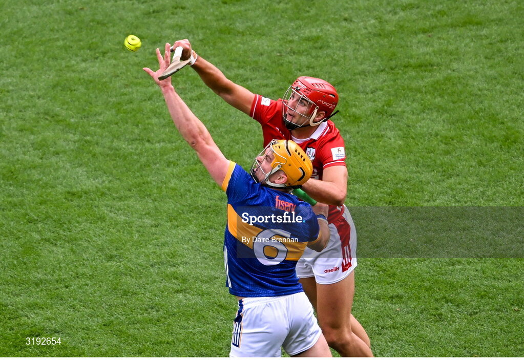 20 July 2025; Ronan Maher of Tipperary and Brian Hayes of Cork contest a dropping ball during the GAA Hurling All-Ireland Senior Championship final match between Cork and Tipperary at Croke Park in Dublin. Photo by Daire Brennan/Sportsfile