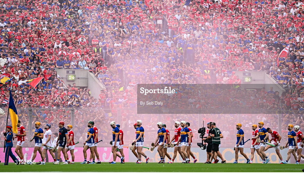 20 July 2025; Players parade before the GAA Hurling All-Ireland Senior Championship final match between Cork and Tipperary at Croke Park in Dublin. Photo by Seb Daly/Sportsfile