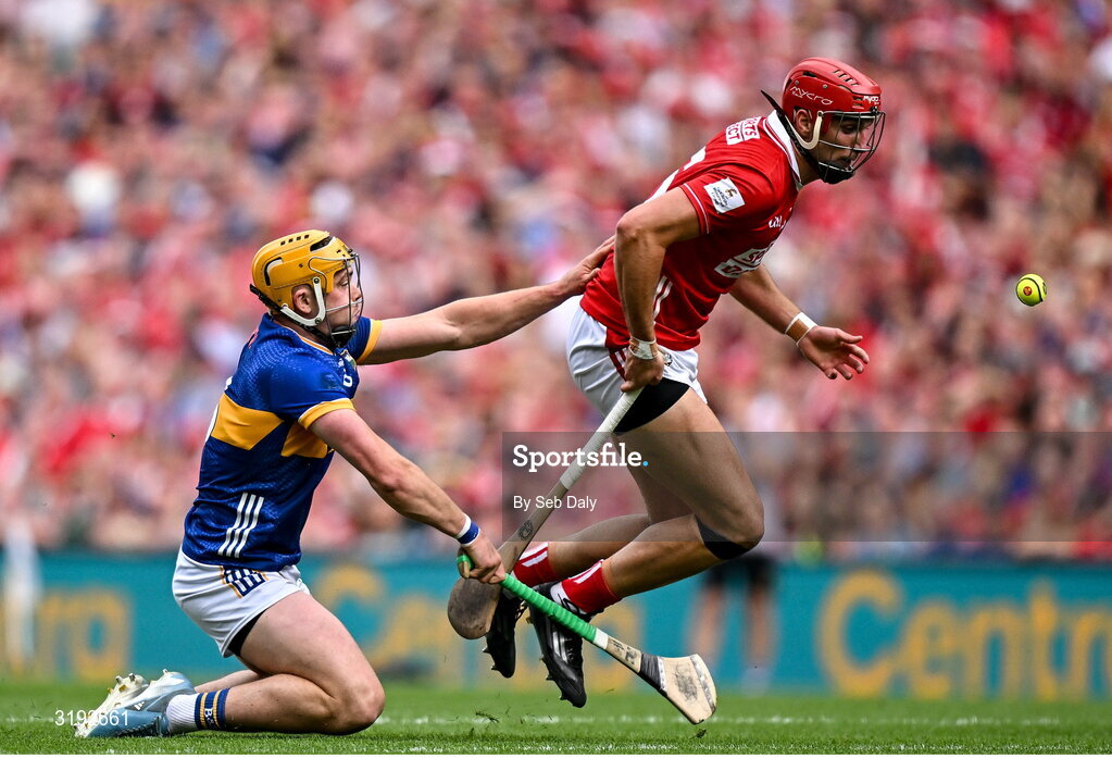 20 July 2025; Brian Hayes of Cork in action against Ronan Maher of Tipperary during the GAA Hurling All-Ireland Senior Championship final match between Cork and Tipperary at Croke Park in Dublin. Photo by Seb Daly/Sportsfile