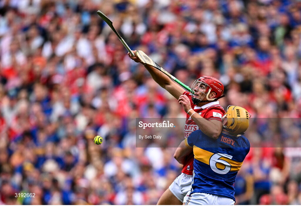 20 July 2025; Brian Hayes of Cork in action against Ronan Maher of Tipperary during the GAA Hurling All-Ireland Senior Championship final match between Cork and Tipperary at Croke Park in Dublin. Photo by Seb Daly/Sportsfile
