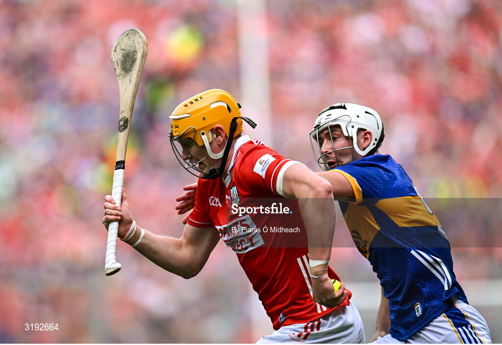 20 July 2025; Shane Barrett of Cork in action against Craig Morgan of Tipperary during the GAA Hurling All-Ireland Senior Championship final match between Cork and Tipperary at Croke Park in Dublin. Photo by Piaras Ó Mídheach/Sportsfile