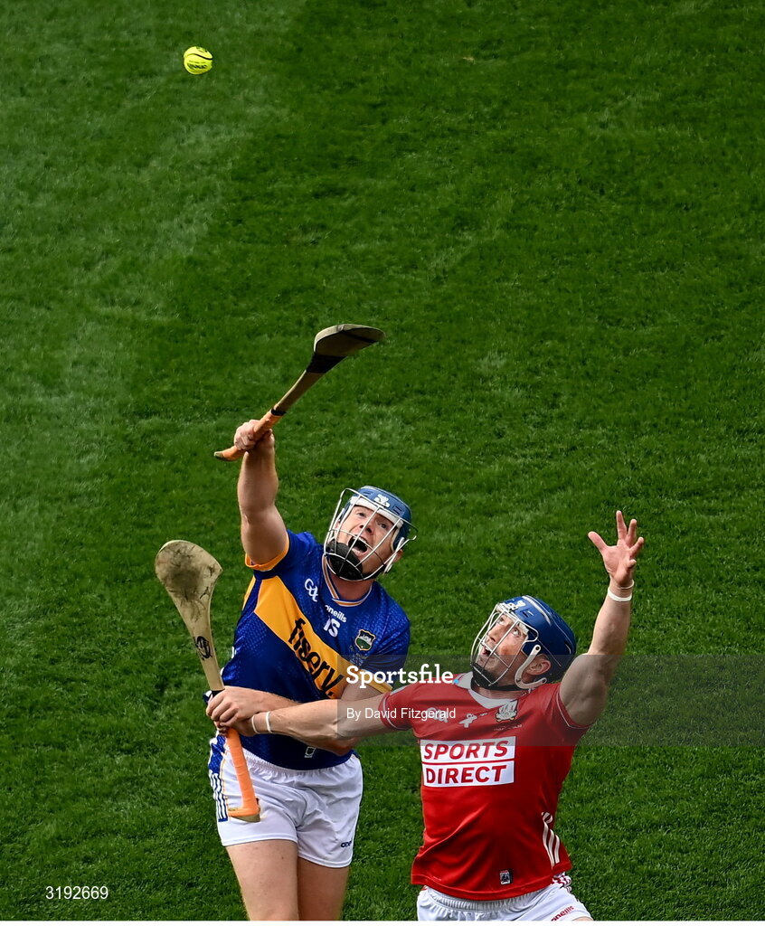 20 July 2025; Jason Forde of Tipperary in action against Seán O'Donoghue of Cork during the GAA Hurling All-Ireland Senior Championship final match between Cork and Tipperary at Croke Park in Dublin. Photo by David Fitzgerald/Sportsfile