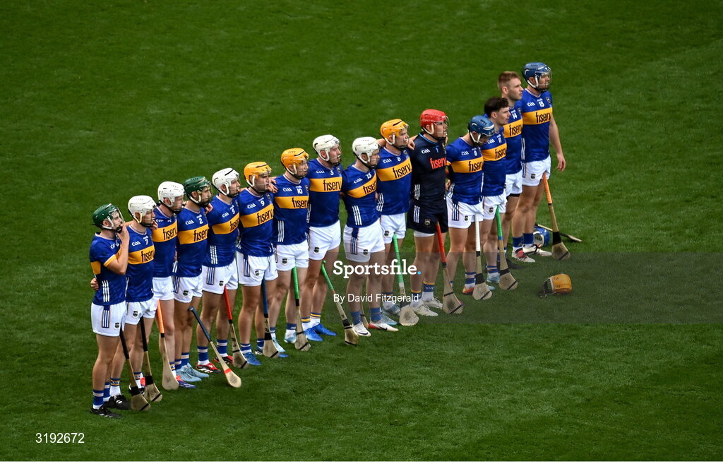 20 July 2025; The Tipperary team stand for Amhrán na bhFiann before the GAA Hurling All-Ireland Senior Championship final match between Cork and Tipperary at Croke Park in Dublin. Photo by David Fitzgerald/Sportsfile